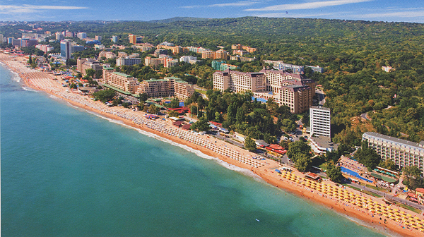 The Golden sands resort is 18 kilometers north of the city of Varna and near the Golden Sands National Park. It is a magnificent resort, the largest one on the Northern Black Sea coast, with richly wooded hills, white golden beach and clear blue sea. There are lots of famous and ancient mineral water springs, which have a flow of 150 m/sec and were known already to the Thraciains and the Roman Caesars. The resort's beach strip is 3,5 km. long and up to 100 m wide. The average air temperature in Summer is 27-30 degrees and the water temperature is 25-28 degrees.